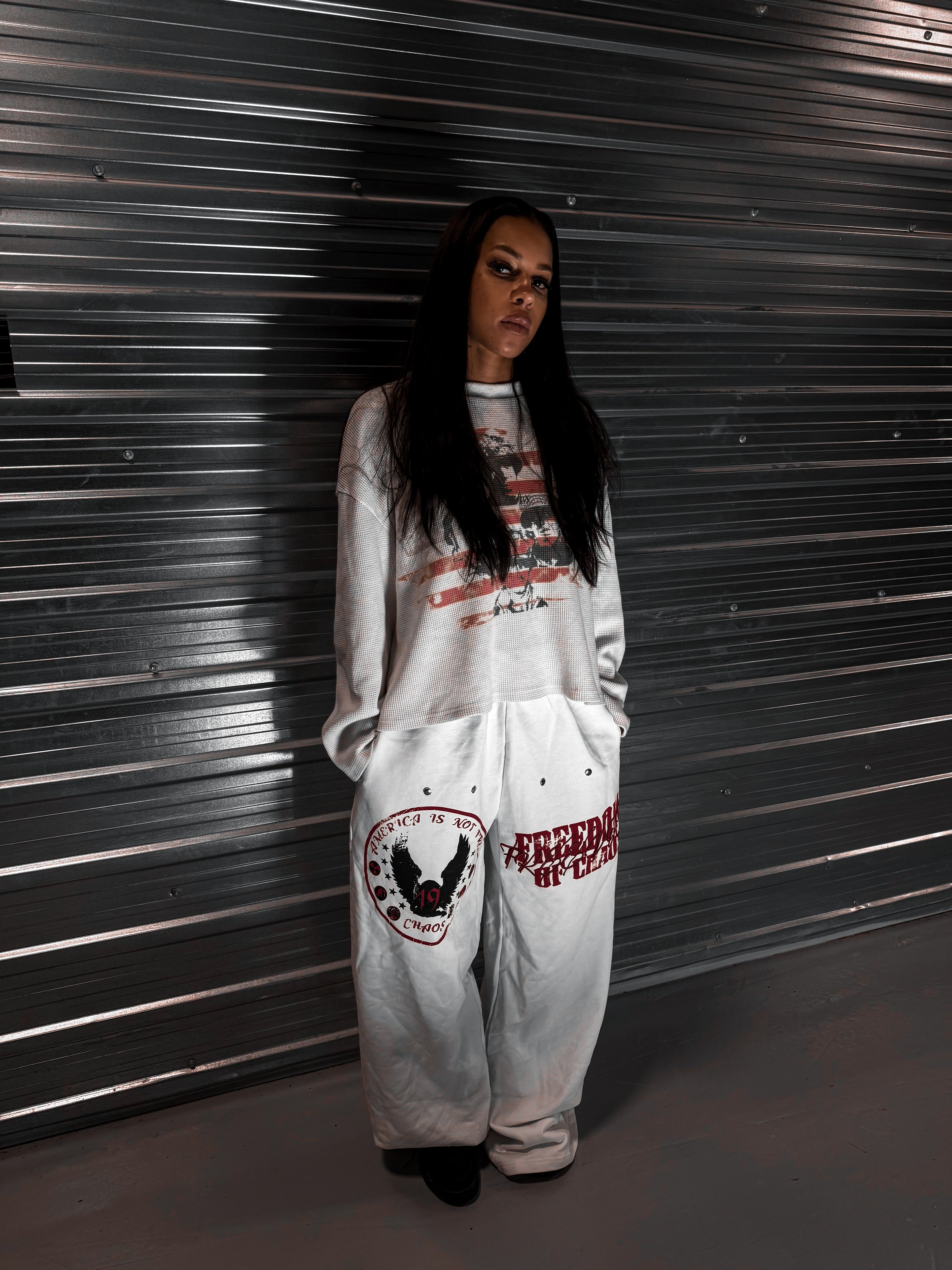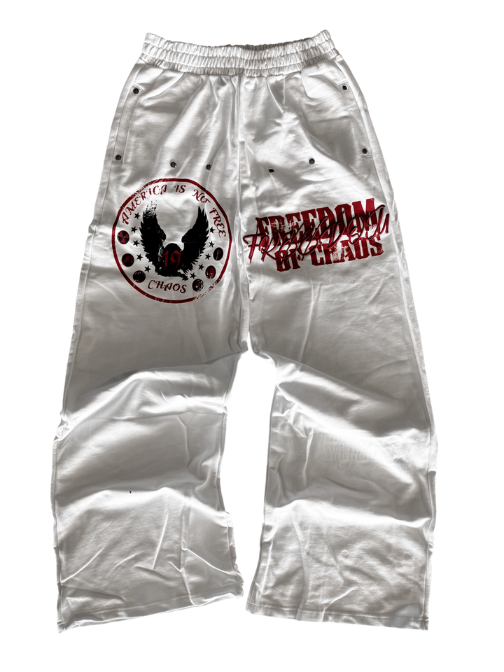 AMERICAS CHAOS SWEATS - White french terry cotton sweatpants with custom hand sewn 3D-Embroidery. Features screen printed designs as well. Has two custom metal side pockets, and one deep back pocket.